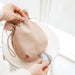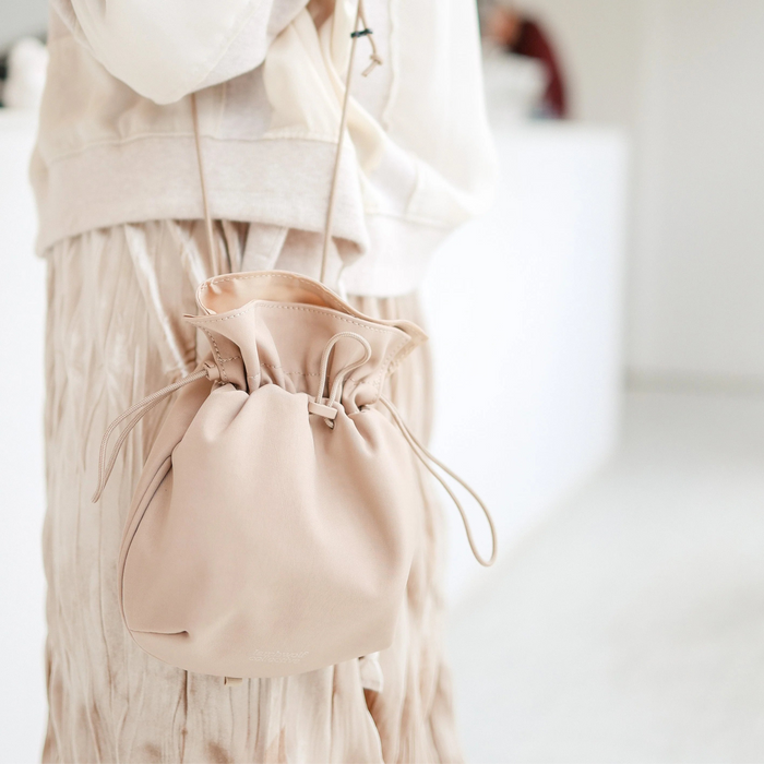 The sling pouch is made out of vegan leather that is water repellent. Spot clean or hand wash only.